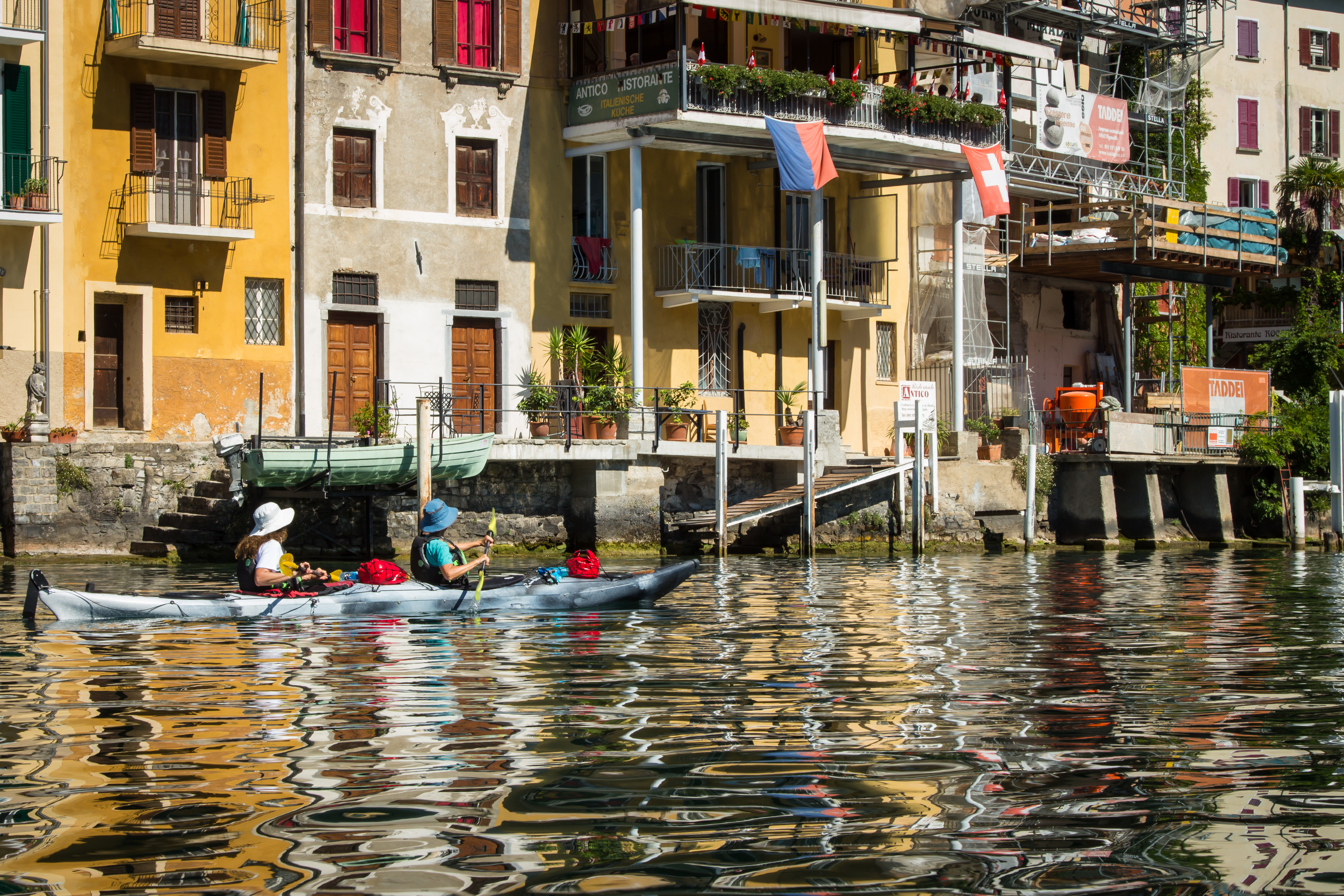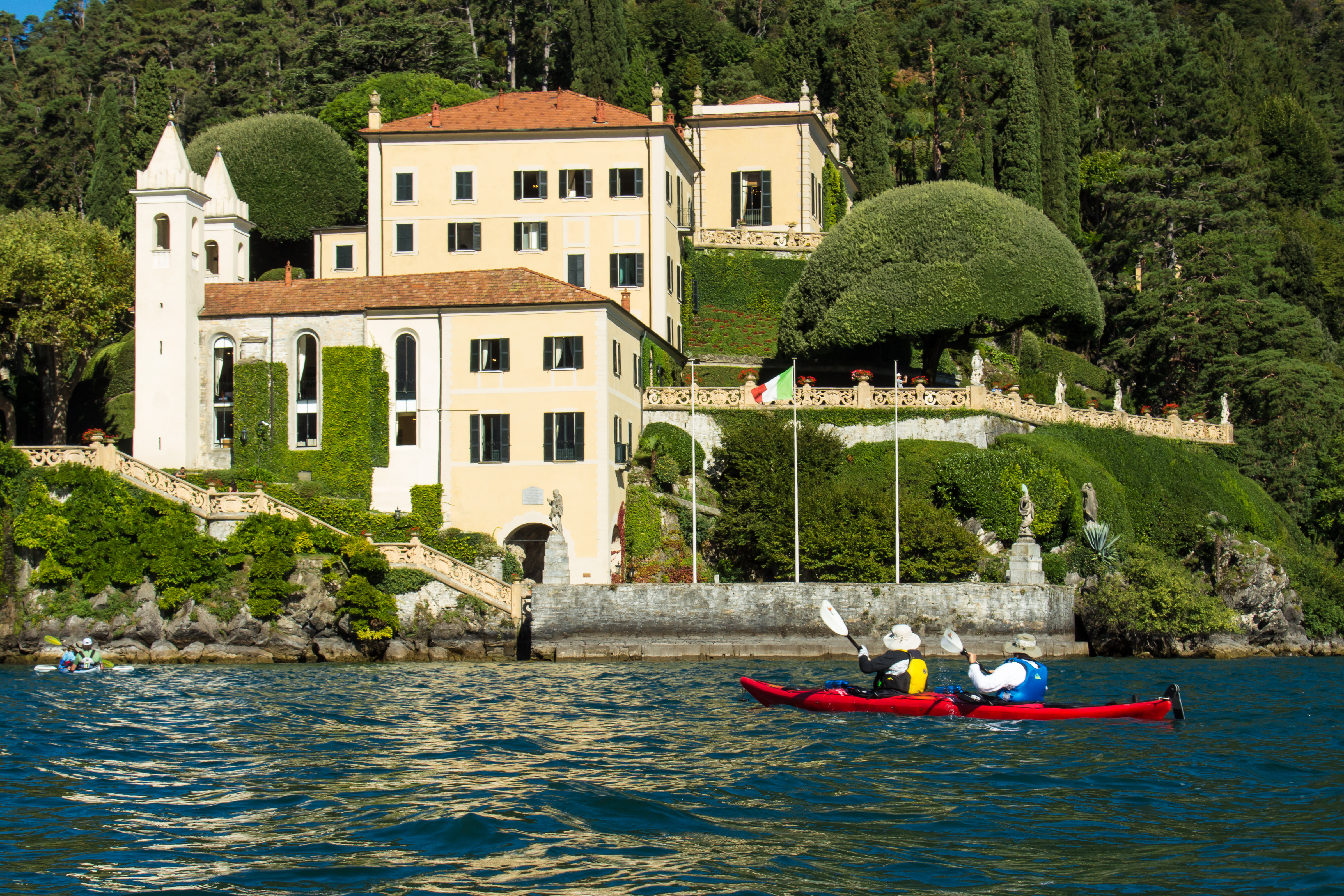 Packing the van, we drive back into Italy and the shores of majestic Lago Maggiore, the second biggest lake in the country, and the setting for Ernest Hemingway's " A Farewell to Arms". After checking into our hotel in the charming town of Laveno, we'll take a ferry across the lake and kayak the Borromean Islands, controlled by the aristocratic Borromeo family since the 12th century, who transformed them from rocky outcrops into elaborate showcases of wealth and culture. We'll land on Isola dei Pescatori, the island of the fishermen, wander through the narrow cobbled walkways of the village, have an espresso, and take some time to enjoy the idyllic atmosphere of the island before we paddle towards the remarkable Isola Bella. With its stunning baroque palace and spectacular ten-tiered terraced gardens, it creates what is known as the "garden ship" effect. After circumnavigating the island, we paddle to the town of Stresa and board the waiting van for the drive and ferry ride back to Laveno. Tonight's dinner is at a local restaurant, where we can celebrate our journey of discovery through the Lake District